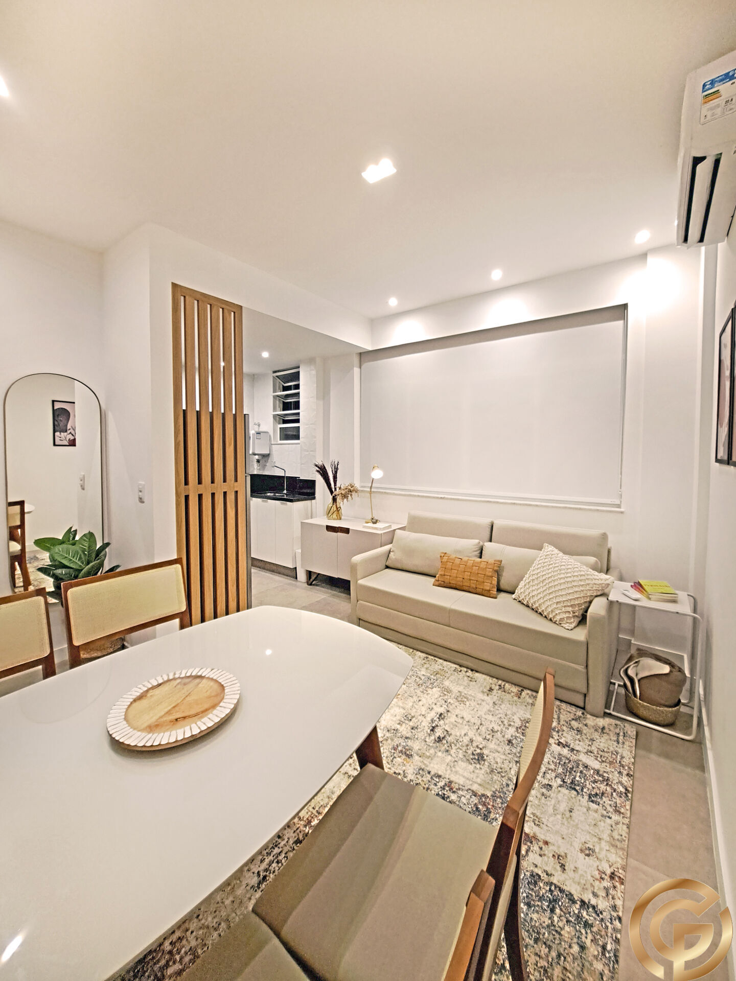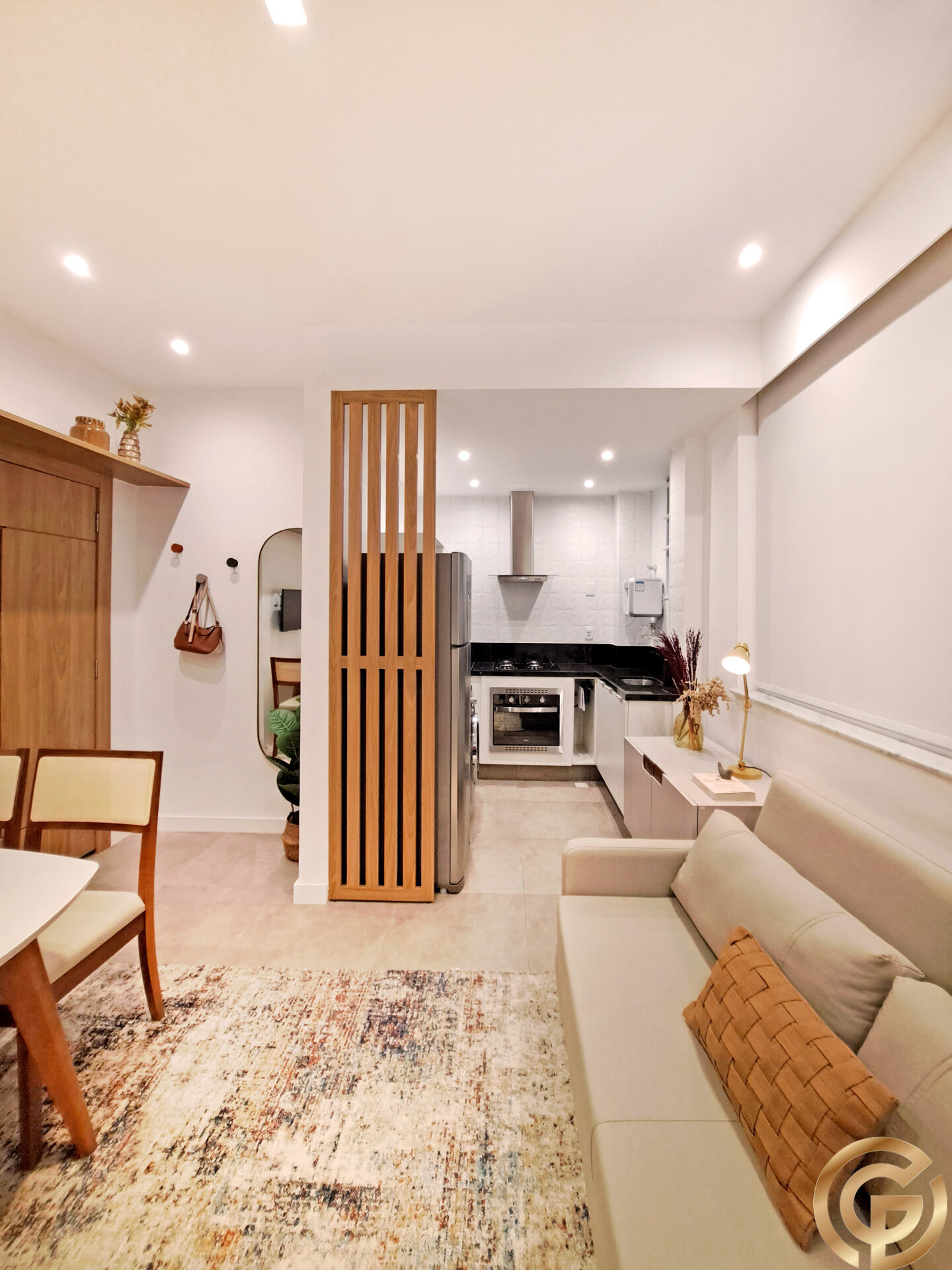 PORTEIRA FECHADA, 35m², Sala e 1 suíte, reformado e planejado por arquiteta, com armários, prateleira e painel de TV com assinatura Romanzza, piso porcelanato 60x60 em todos os ambientes. Sala com prateleira, painel de TV e split; cozinha americana com armários, forno embutido, cooktop 4 bocas, 1 suíte com armários, split e box com blindex.