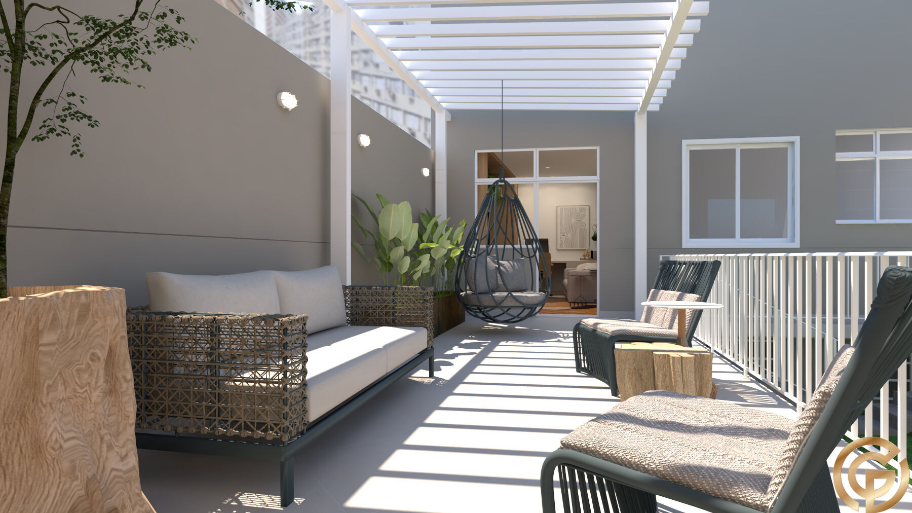 Prisma interno com 83m², revertido para espaço garden em dois níveis. Nível mais alto com área de ligação entre suíte master e quarto de hóspedes / serviço e nível mais baixo com grama sintética.