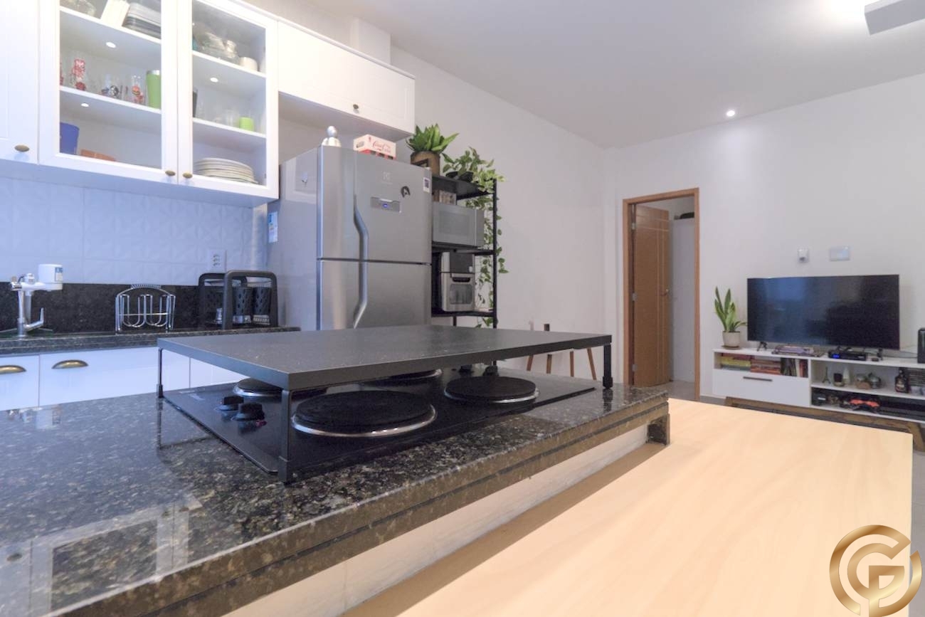 Apartamento tipo garden, sala com sofá de 3 lugares, rack e mobília decorativa; cozinha americana completa, com armários, cooktop por indução de 4 bocas e bancada em granito; quartos com armários; banheiro social completo com revestimentos Geo Chrome e Classic Bianco, blindex e máquina de lavar; área externa com chuveiro, lavanderia e copa.