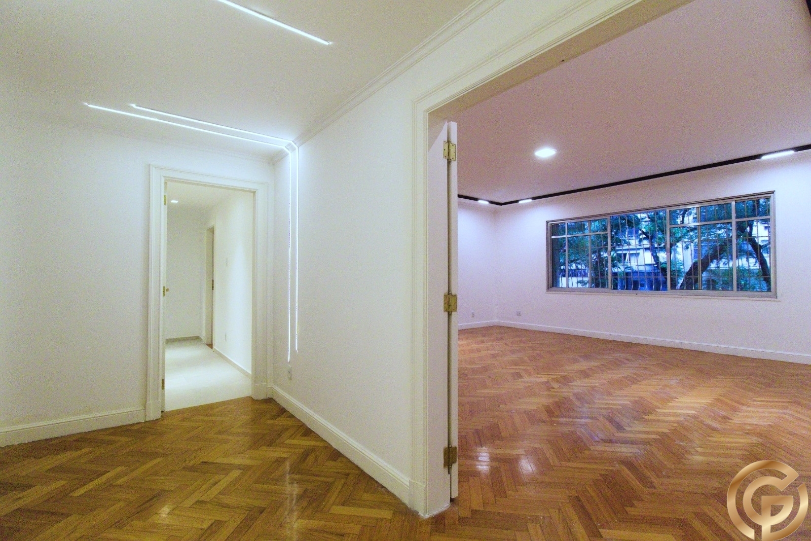 Apartamento com portas duplas de entrada, piso parquet espinha-de-peixe nas áreas comuns; Hall de entrada com separação por belas portas duplas; Duas salas, sendo a de estar com mais de 40m² e sala de jantar com quase 30m², separadas por portas de madeira maciça; Hall de circulação social e hall de circulação de serviço; Lavabo; Ampla copa-cozinha entregue com armários Romanzza e mesa de jantar com tampo de vidro laqueado e madeira, torre quente com forno e microondas embutidos, estações de trabalho separadas com 02 cooktops, 02 coifas e 02 bancadas molhadas com pias separadas; 02 dependências completas de serviço com banheiro entre ambas, os quartos são espaçosos 13m² e 9m², sendo 1 deles revertido para escritório; Área de serviço separada da cozinha; 4 quartos, sendo 02 suítes e 2 quartos com banheiros sociais próximos (01 banheiro social para cada quarto).