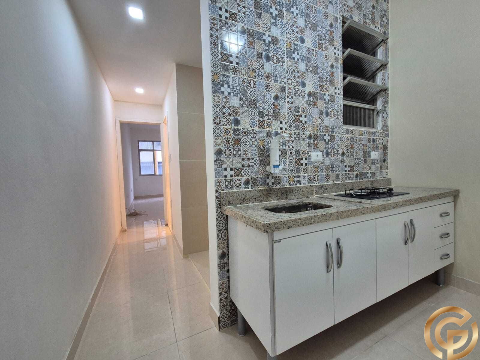 Apartamento de 27 m², em rua residencial arborizada. Composto por 1 quarto com janelão, banheiro, sala acoplada com cozinha planejada, bancada de granito, cooktop e pequena área de serviço.