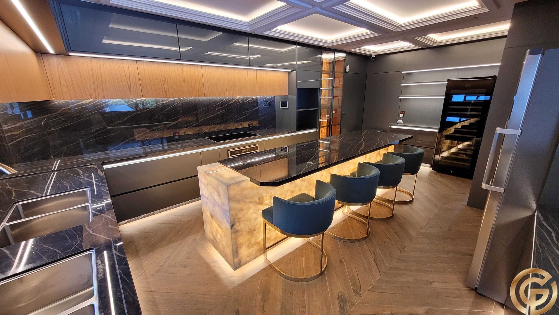 Primeiro pavimento: sala ampla dividida em vários ambientes, cortinas e luzes com total automação, jardim de inverno com cascata, escritório, lavabo. Copa cozinha planejada, despensa, tudo repleto de armários.