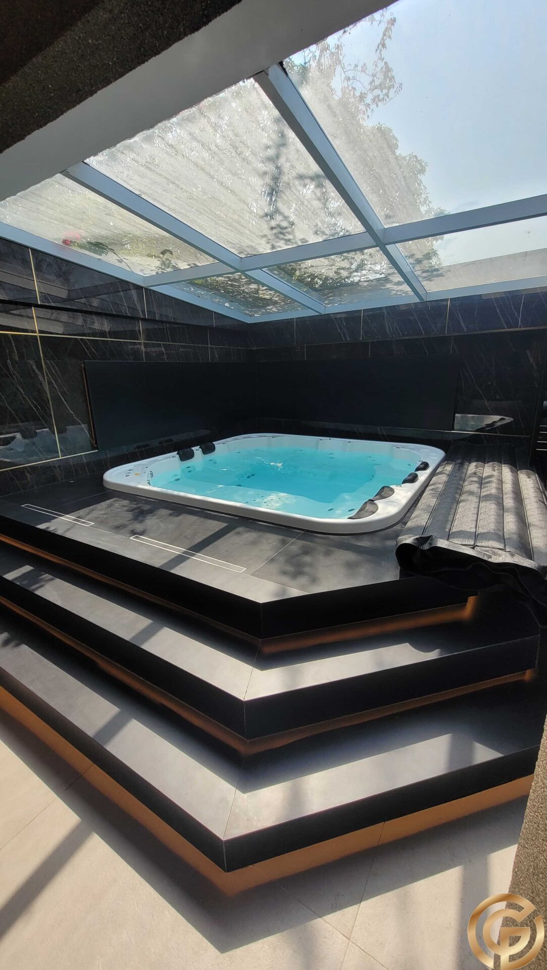 Área de lazer com piscina, sauna molhada com cascata, e SUPER SPA.