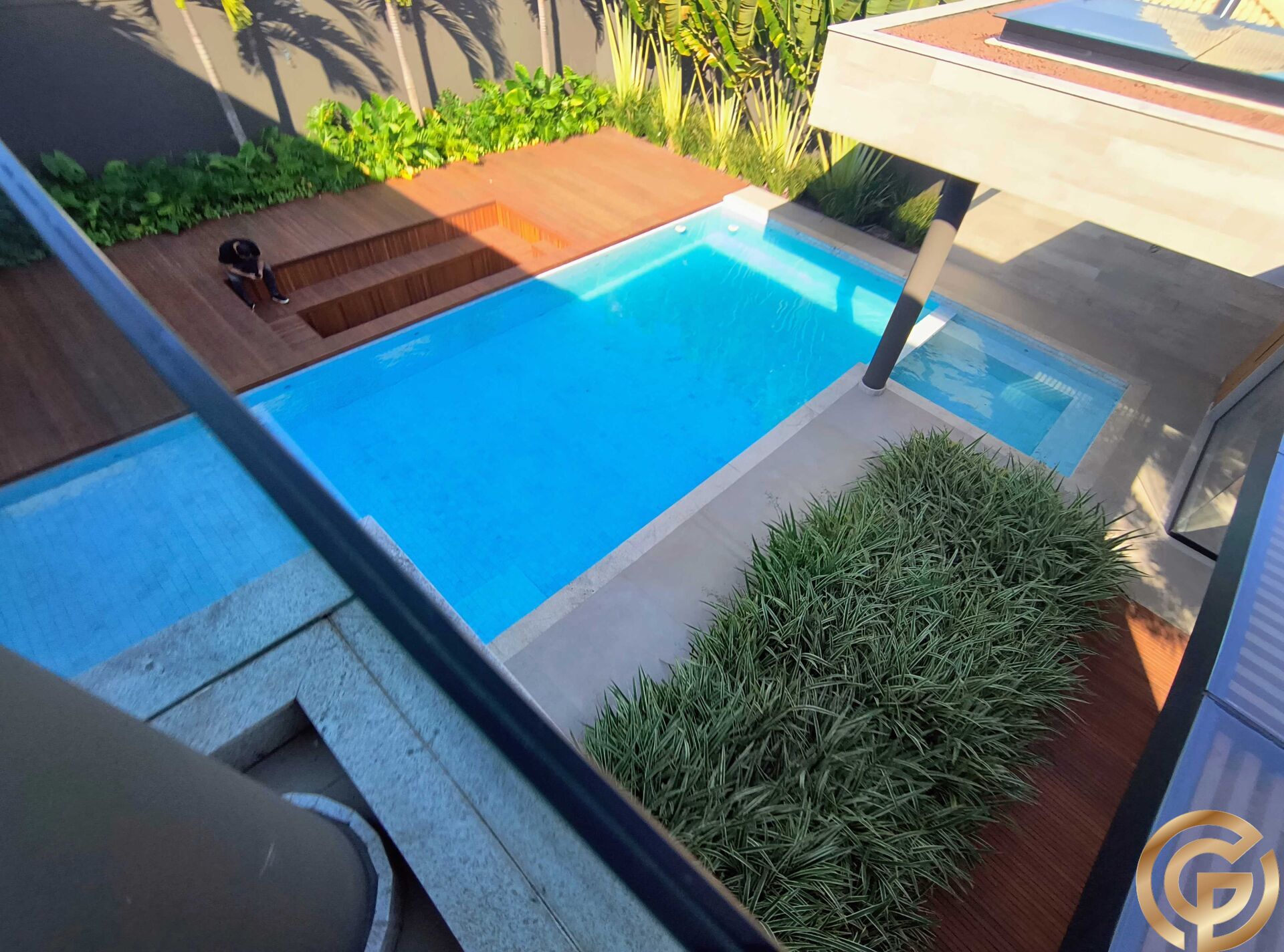 O térreo é perfeito para receber, com espaço gourmet completo, cozinha integrada à copa e à área de lazer, piscina com hidromassagem, sauna estilo aquário e a vapor, churrasqueira, paisagismo de alto padrão e sistema de captação de água da chuva.