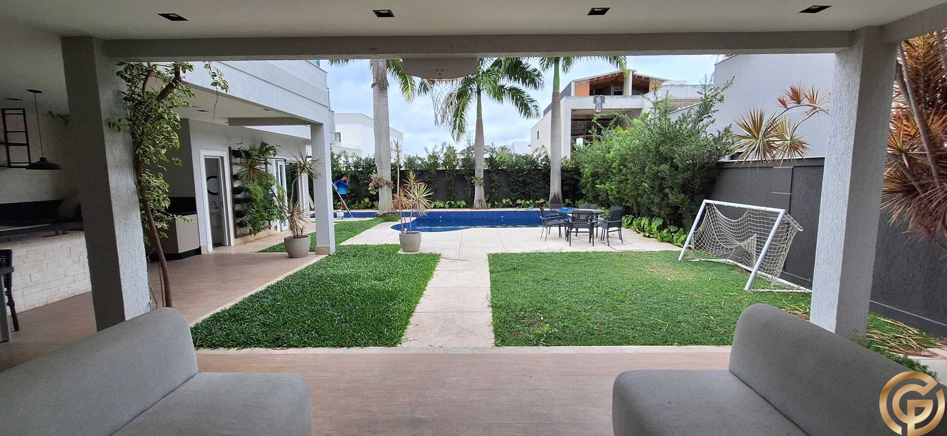 Área de lazer com piscina, espaço gourmet e jardins planejados